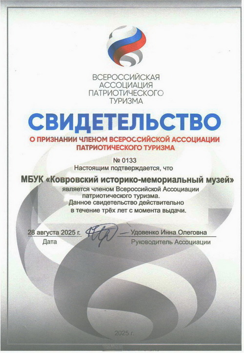 Ковровский историко-мемориальный музей признан членом Всероссийской ассоциации патриотического туризма. Свидетельство было получено 25 августа.