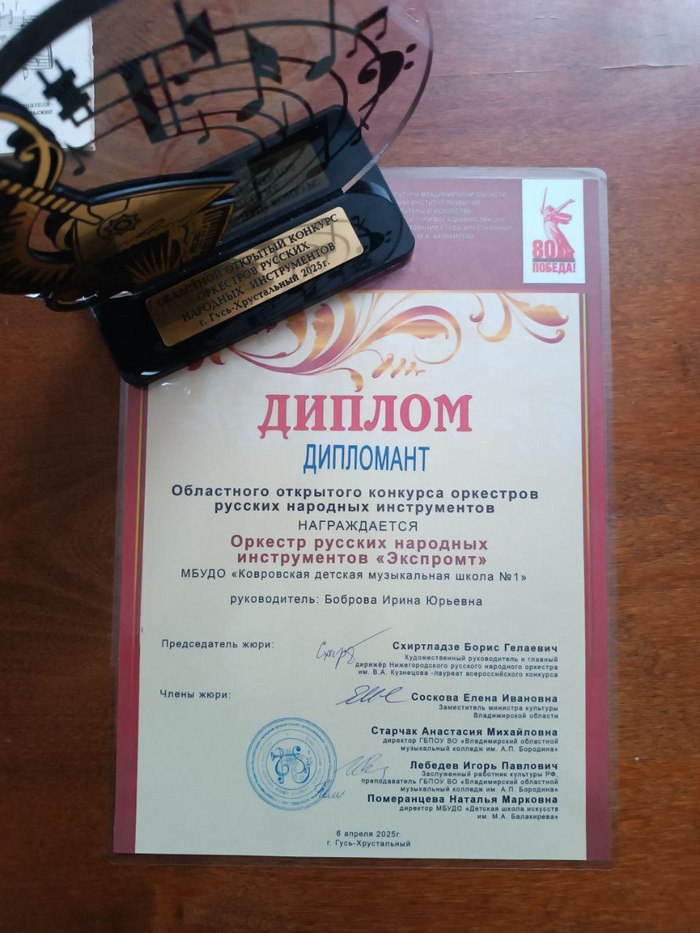 Оркестр русских народных инструментов «Экспромт» Ковровской детской музыкальной школы № 1 (руководитель и дирижер Боброва Ирина Юрьевна) по результатам областного открытого конкурса оркестров удостоен звания Дипломанта.