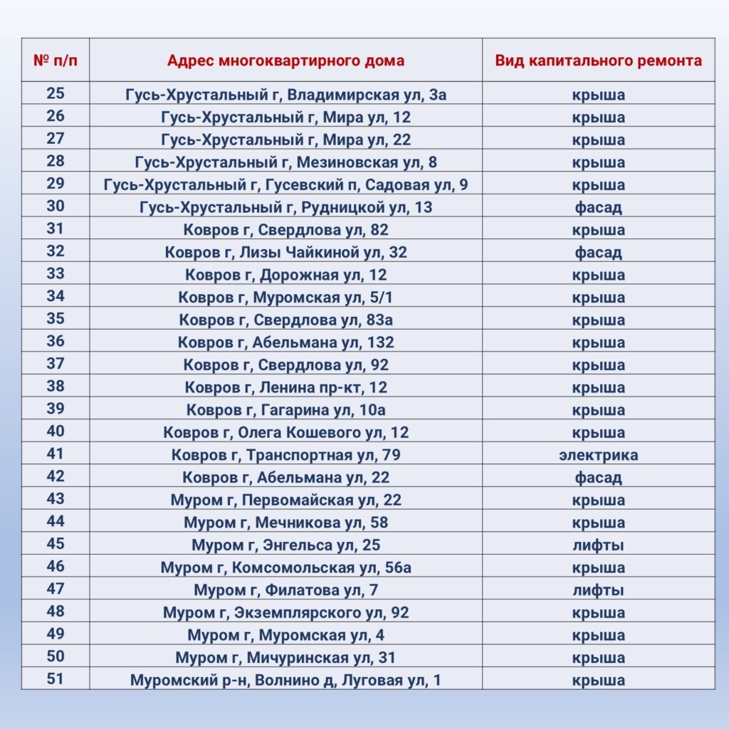 Правительство Владимирской области опубликовало список многоквартирных домов, в которых в этом году проведут капитальный ремонт. Всего в этом году во Владимирской области запланирован капремонт в 128 многоквартирных домах, 12 из них в Коврове.