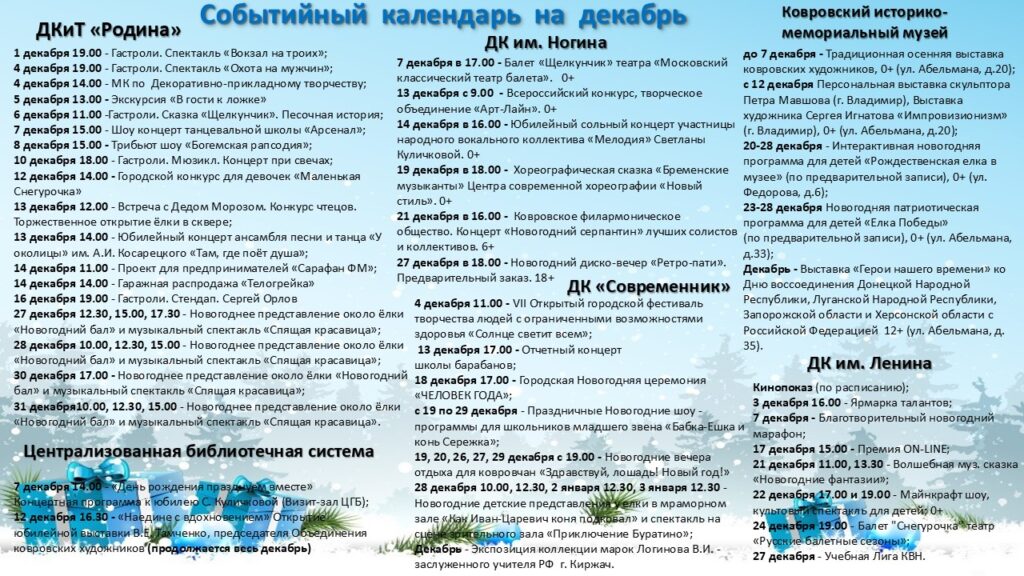 В ближайшие две недели новогодних каникул ковровчане смогут посетить детские новогодние елки, кинотеатры, выставки, послушать живой джаз, встретить поезд Деда Мороза, попить чай в доме-музее оружейника Василия Дегтярева и т.д. Культурная программа подготовлена для всех возрастов и вкусов.