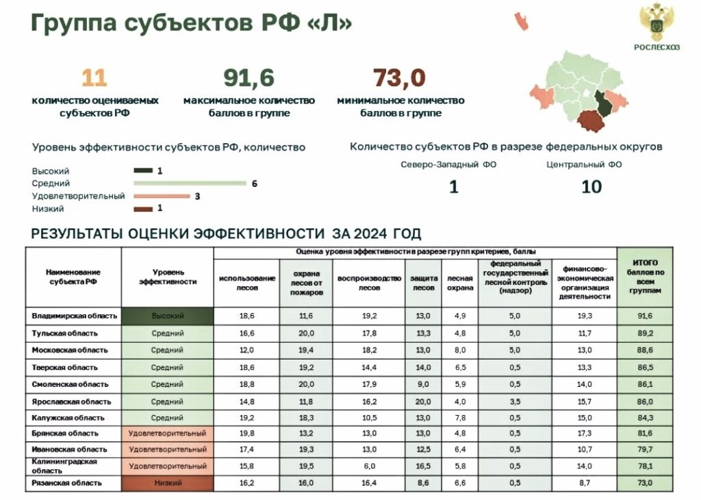 По данным Федерального агентства лесного хозяйства, уровень эффективности осуществления переданных полномочий в области лесных отношений за 2024 год, возложенных на Министерство лесного хозяйства Владимирской области, остаётся высоким. В своей группе «Л» наш регион – на первом месте, набрав 91,6 балла. Область вошла в десятку лидеров по эффективности ведения лесного хозяйства.