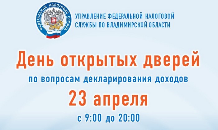 23 апреля с 9:00 до 20:00 в обособленных подразделениях УФНС России по Владимирской области пройдет региональная акция «День открытых дверей» для налогоплательщиков – физических лиц. Адрес в городе Коврове: ул. Комсомольская, 116а.