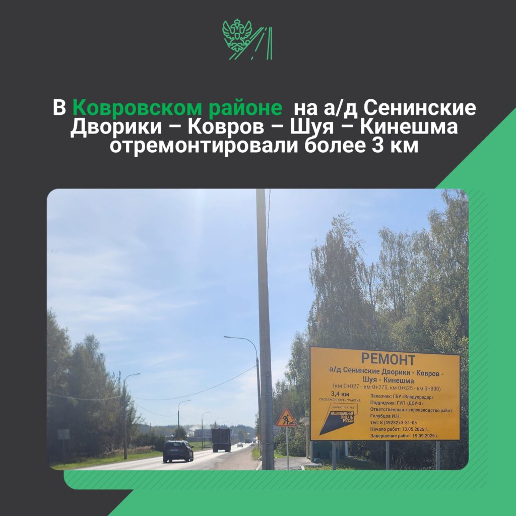 Общая протяженность ремонта составила 3,4 км.Автомобильная дорога Сенинские Дворики – Ковров – Шуя – Кинешма – транзитная, по которой можно добраться до Иваново, Костромы, Вологды и даже до Петрозаводска.Непосредственно отремонтированные участки с 1 по 4 км ведут к крупному предприятию региона – Владимирскому карьероуправлению — поставщику самого востребованного строительного дорожного материала – щебня.«Стало намного комфортней ездить по этой дороге, чувствуешь себя более безопасно, единственное, что еще хотелось бы – чуть расширить дорожное полотно, так как с каждым днем возрастает количество машин и уже тесновато» — поделился своим мнением Максим, который на работу каждый день добирается именно этим путем.Благодаря нацпроекту «Инфраструктура для жизни» комфортными, безопасными и качественными дорогами обеспечиваются не только города, но и малые населенные пункты, а также значимые промышленные предприятия региона.